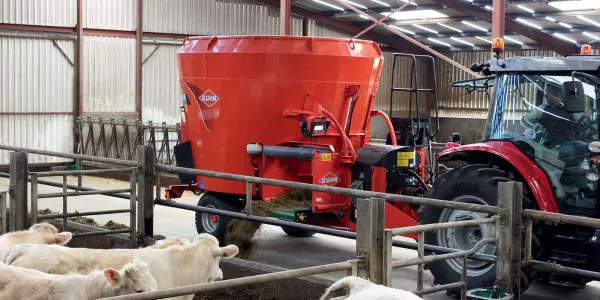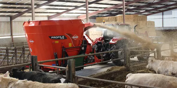 Wóz paszowy PROFILE PLUS 1 CL z pionowym ślimakiem, turbiną do ścielenia słomą i przenośnikiem poprzecznym, wyposażony w szeroki zbiornik. Dostępny ze zbiornikami o pojemności od 12 do 15 m³, przeznaczony dla stad liczących od 60 do 110 sztuk bydła mlecznego.