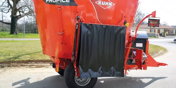 Wóz paszowy PROFILE PLUS 1 DL z 1 pionowym ślimakiem, wentylatorem do ścielenia słomą i bocznym wysypem paszy, wyposażony w szeroki zbiornik. Dostępny ze zbiornikami od 12 do 15 m3, dla stad liczących od 60 do 110 sztuk bydła mlecznego.