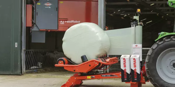 KUHN RW 1200 jest trzypunktowo zawieszanym modelem z szybkim zaczepem, idealnym do operacji typu "owiń i odłóż na stertę" na polu lub w gospodarstwie. Owijanie w miejscu składowania oznacza mniejsze ryzyko wiążące się z uszkodzeniem folii.