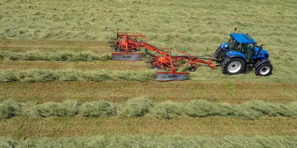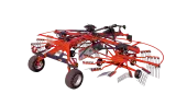 Nowe zawieszane i półzawieszane zgrabiarki dwukaruzelowe, które formułują wał pokosu po środku zgrabiarki, wyróżniają się na tle konkurencyjnych modeli wyjątkowym kopiowaniem nierówności terenu, trwałością i niezawodnością. Dzięki swoim szerokościom roboczym zapewniają wysoką wydajność powierzchniową. Przekładnia MASTERDRIVE GIII pozwala na intensywną pracę w trudnych warunkach. Co ważne, karuzele zgrabiarki dwukaruzelowej mogą być podnoszone pod różnym kątem, dzięki czemu w szczególnych przypadkach można uzyskać prześwit ponad 75cm, dzięki czemu nie trzeba obawiać się niszczenia wcześniej zgrabionych wałów pokosu w sytuacji, gdy musimy przez nie przejechać.