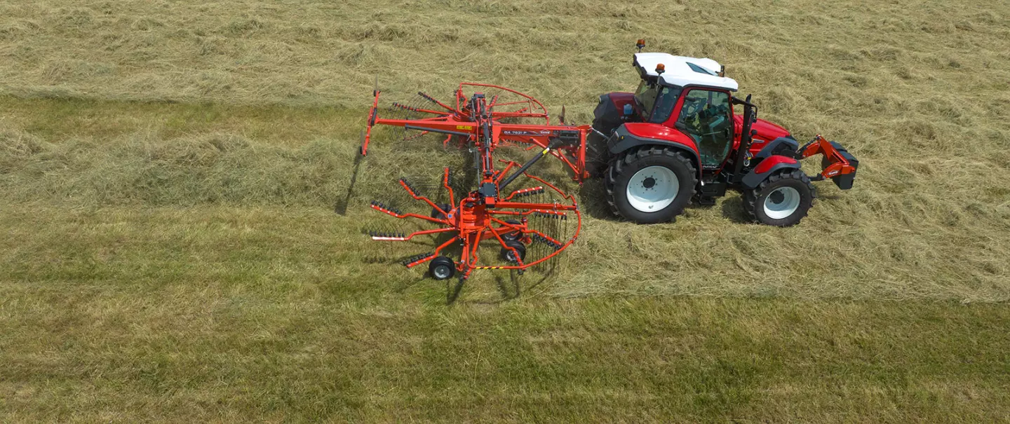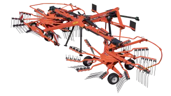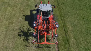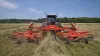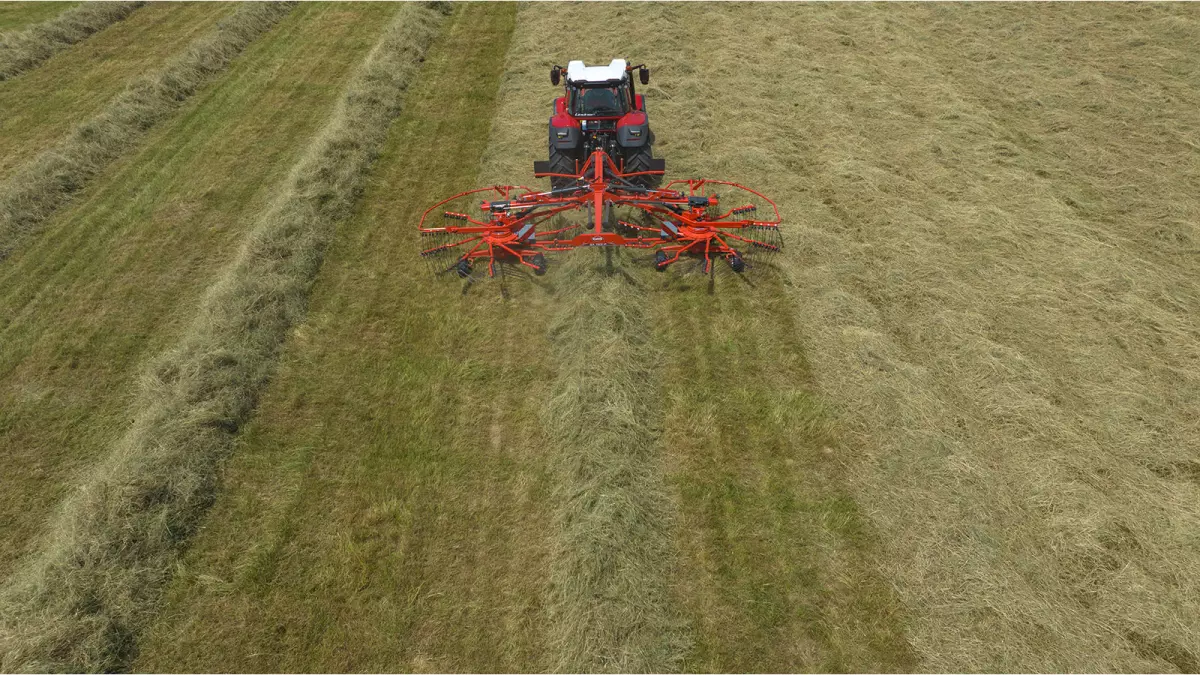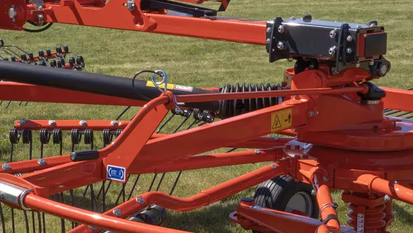 - Zmiana pozycji transportowej na roboczą jest obsługiwana z kabiny ciągnika za pomocą wbudowanego w zgrabiarkę systemu podnoszenia. Hydrauliczne podnoszenia karuzel ułatwia zawracanie na uwrociach i zapewnia wysoki prześwit podczas przejeżdżania nad wałami pokosu. Nie ma potrzeby uruchamiania podnośnika ciągnika. Rezultat: do wykonywania manewrów potrzebny jest jeden zawór dwukierunkowy.