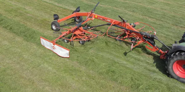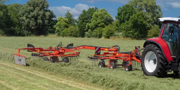 Dwukaruzelowa zgrabiarka GA 6002 formująca wał z boku. Trawa jest zgrabiana z szerokości od 3,50 do 5,80 m w jeden lub 2 wały. Możesz bez problemu pracować tą maszyną z ciągnikami o małej lub średniej mocy.
