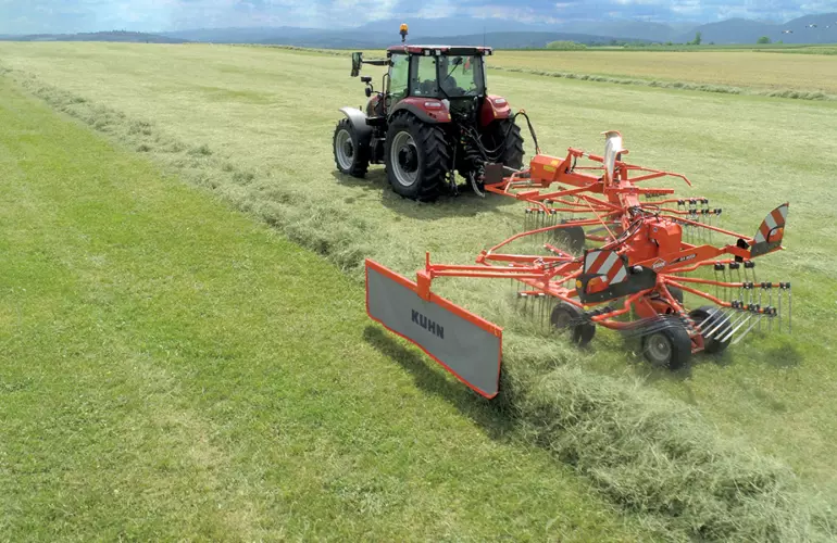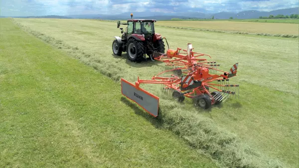 Szerokość zgrabiania jest regulowana hydraulicznie w zakresie od 3,00 do 5,80 m. Zmienna gęstość pokosu, omijanie przeszkód, czy zakończenie pola nie stanowią już problemu. W przypadku bardzo gęstego pokosu lub zgrabiania paszy na noc, model GA 6002 może formować dwa wały w jednym przejeździe.