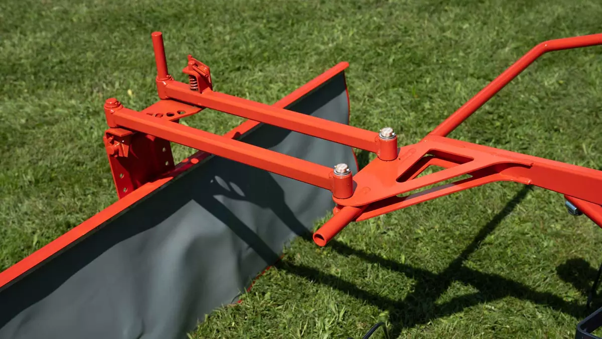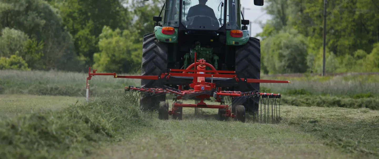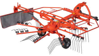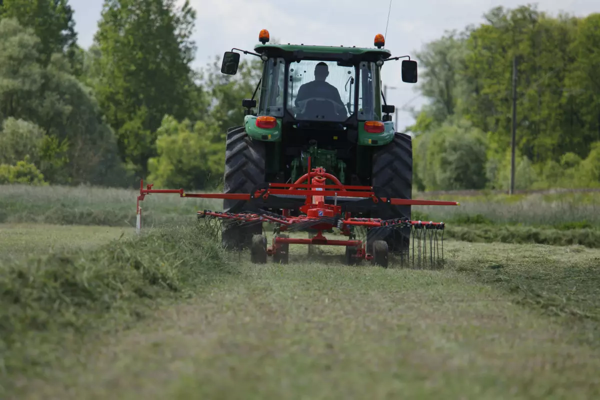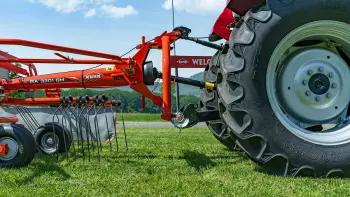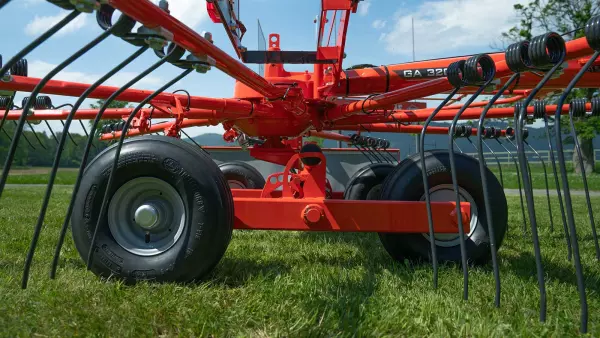 Jeśli Twoje pola są położone na pochyłym terenie, wybierz model GA 3201 G ze sztywną głowicą zaczepową, dzięki któremu zgrabiarka będzie wiernie podążać po śladach ciągnika nawet na stromych zboczach. Ten model jest wyposażony również w skrętne koła, na których znajdują się dźwignie regulacji wysokości zgrabiania.