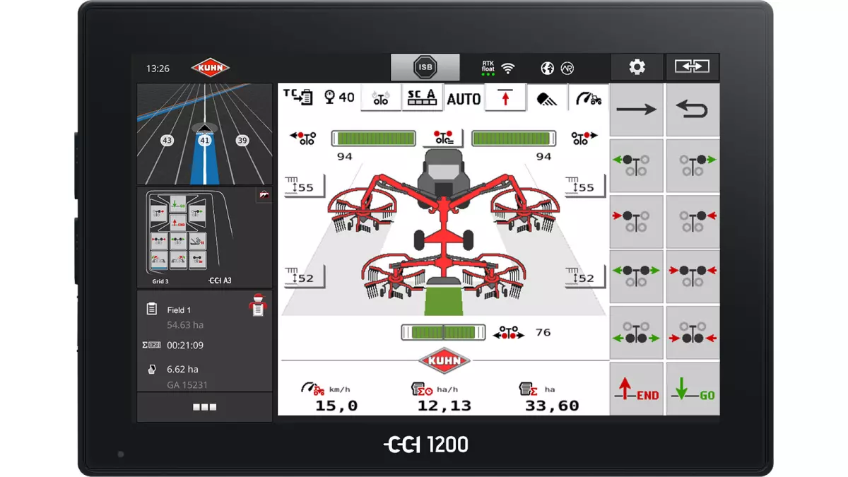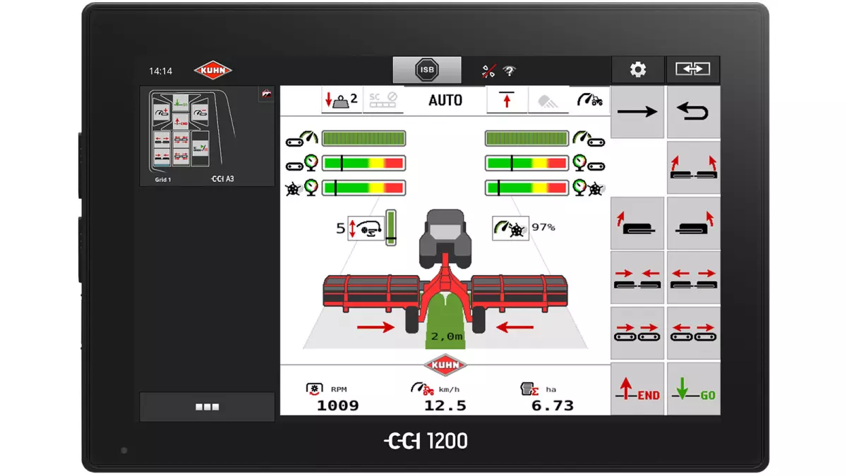 CCI 1200 to wiodący na rynku pod względem wydajności i wszechstronności zastosowania terminal ISOBUS. Duży, ekran dotykowy o przekątnej 12,1” z powłoką antyrefleksyjną zapewnia operatorowi doskonały podgląd niezależnie od oświetlenia zewnętrznego. Funkcja Multi-Touch (wielodotyku) zapewnia intuicyjną nawigację i wybory na wyświetlaczu, podobnie jak na tablecie lub smartfonie. Duży rozmiar terminala pozwala na jednoczesne wyświetlanie kilku ekranów roboczych. Przykładowo, w tym samym czasie możemy mieć podgląd na ekran roboczy maszyny i obraz z kamery zamontowanej na maszynie. Innym przykładem jest podgląd na ekran roboczy maszyny i obok na informacje z komputera pokładowego ciągnika. Możliwości ekranu terminala CCI 1200 eliminują potrzebę instalowania kilku monitorów i oszczędzają miejsce w kabinie ciągnika.